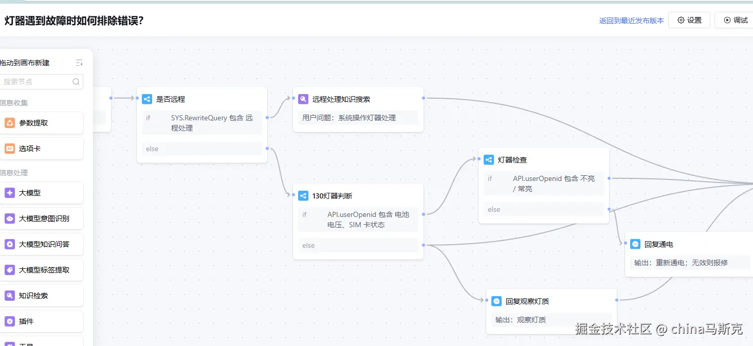 对于复杂场景,我们还可以创建工作流,简单来说就是我们预先设定了工作的流程,先做什么,然后再做什么。工作流清晰界定了每个环节的目标、操作和判断节点,让智能体无需重复决策,快速推进任务。以智慧航道灯器故障为例,工作流可直接引导智能体先通过平台远程排查参数问题,而非直接派人员现场检修,减少无效奔波;同时明确了 “远程重启→现场检测→配件更换” 的优先级,大幅缩短故障响应和解决时间,保障航道通航效率。