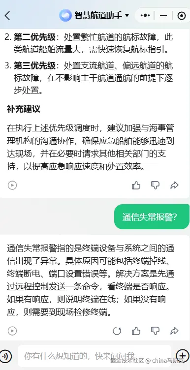 航标维护场景:航标维护人员外出作业前,通过智能体查询不同类型航标终端的清洁、电池更换、信号校准等保养步骤,避免操作失误,保障航标正常运行,减少设备故障发生率。