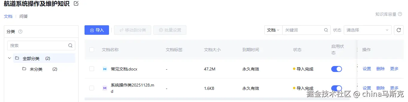 重点来了,我们的智能体是否足够专业,就取决于这里。我整理航道管理部门的官方操作手册、维护规范、故障处理指南等资料,提炼关键知识点,按 “基本知识”“航道系统操作相关”“航道维护相关知识” 分类录入腾讯元器平台知识库,便于精准检索。