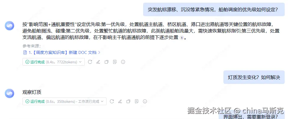 系统故障场景:当航道管理系统出现卡顿、数据异常等问题时,工作人员可通过智能体检索对应故障的排查步骤,按指引快速定位并解决问题,降低系统停运对工作的影响。