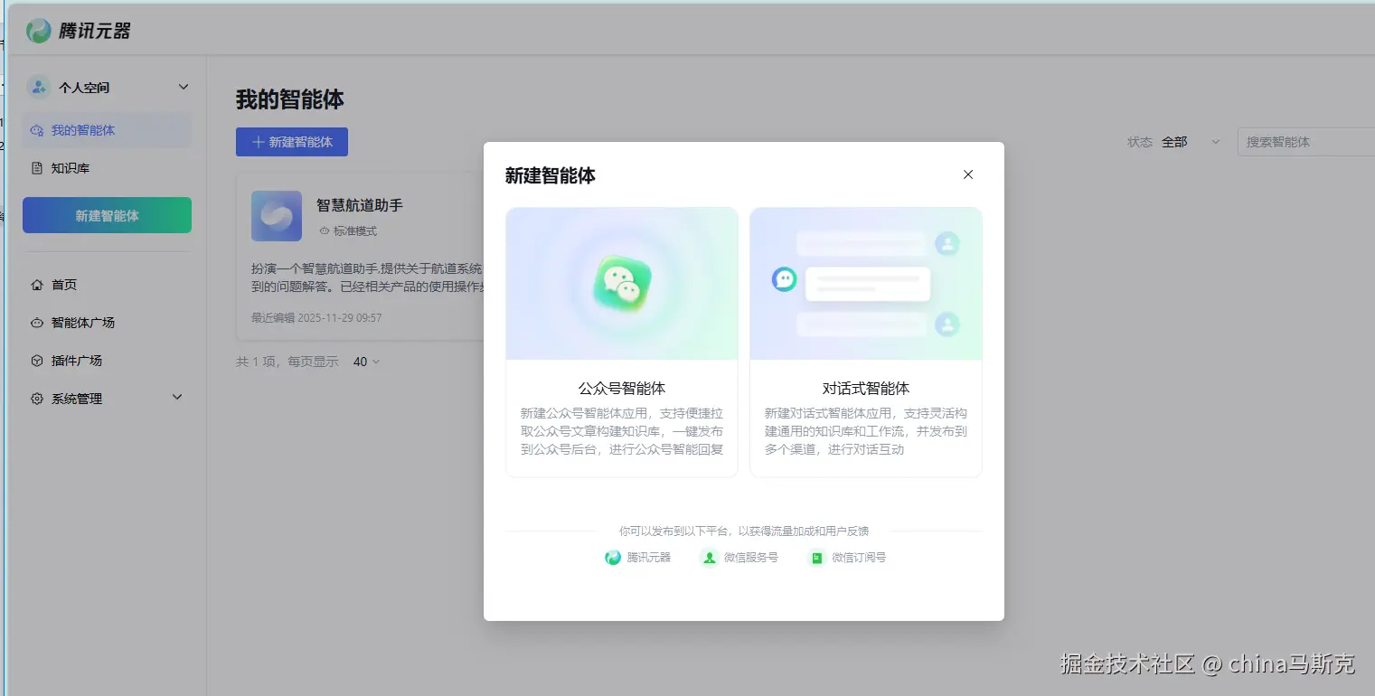 我们选择进入腾讯元器官网,注册并登录:可以看见界面一目了然。在首页,我们选择“新建智能体”,再选择“对话式智能体”。这个可以支持灵活构建通用的知识库和工作流,并发布到多个渠道,进行对话互动。如果是公众号的,也可以选择“公众号智能体”。