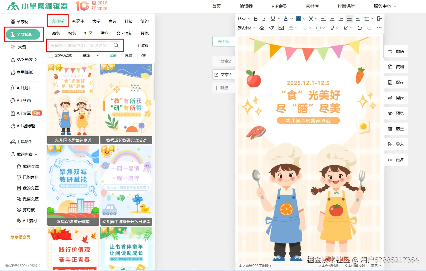 于小墨鹰编辑器左侧的全文模板中,搜索“卡通”或者“可爱”等关键词,或者点击“幼小学”分类。这些模板一般运用明亮的色彩,有着圆润的字体以及活泼的版式设计,去选择一个整体布局清爽透彻干净的模板直接加以应用,便能够保证全文风格维持一致,防止因自己进行搭配而导致的杂乱之感。