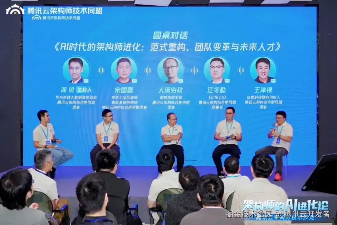 活动最后,来到精彩的圆桌对话环节。在华米科技大数据资深总监、腾讯云架构师合肥同盟理事 周锐的主持下,围绕 “AI 时代的架构师进化:范式重构、团队变革与未来人才”主题,羚羊工业互联网高级系统架构师,腾讯云架构师合肥同盟理事 宋国磊,前端架构专家、腾讯云架构师合肥同盟理事 大漠穷秋,LUMI CTO、腾讯云架构师合肥同盟理事长 江冬勤、优维科技联合创始人、腾讯云架构师合肥同盟理事 王津银,深入探讨架构师如何快速进化,以应对 AI 时代带来的技术挑战,并展望未来职业发展机遇。