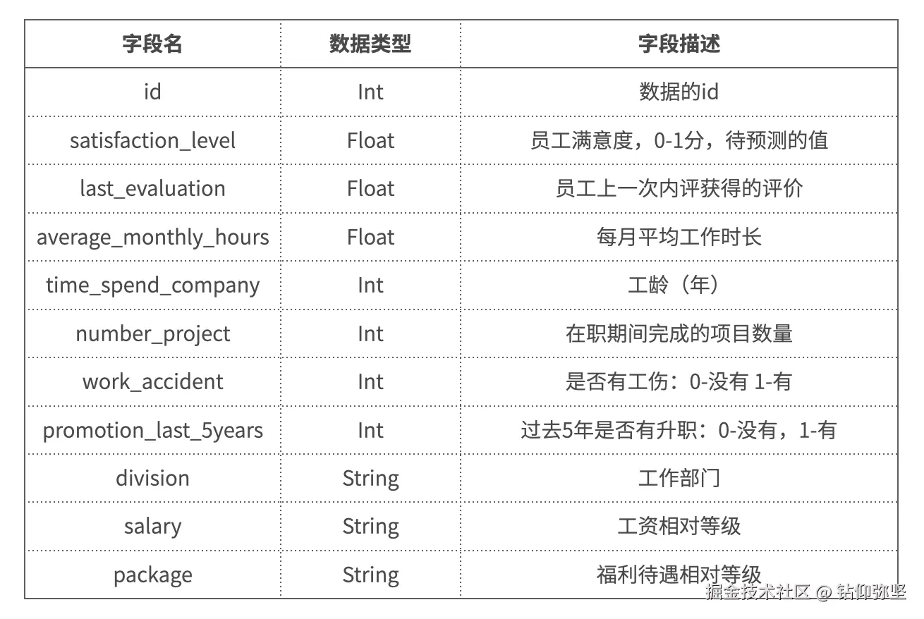 本次练习赛所使用数据集基于**人力资源分析数据集**,并且针对部分字段做出了一定的调整,所有的字段信息请以本练习赛提供的字段信息为准,字段信息内容参考如下: