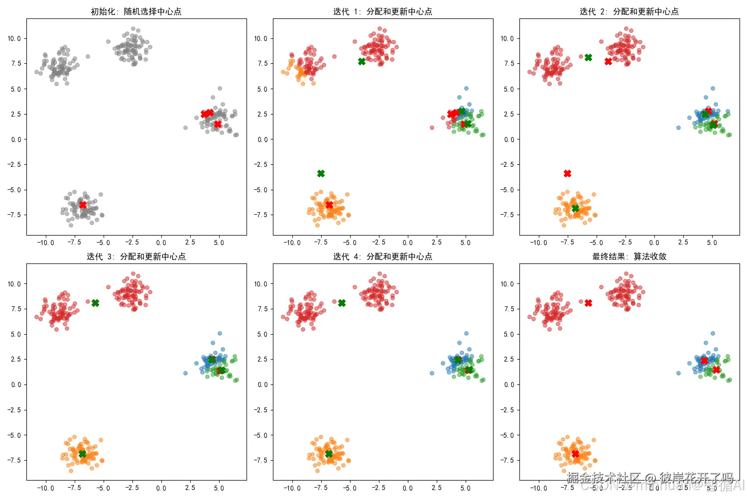 - **迭代过程:**算法不是一步到位的,它通过不断“分配-更新”来逐步优化结果。