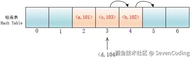 它的实现是在插入一个元素的时候,先通过哈希函数进行判断,若是发生哈希冲突,就以当前地址为基准,根据再寻址的方法(探查序列),去寻找下一个地址,若发生冲突再去寻找,直至找到一个为空的地址为止。