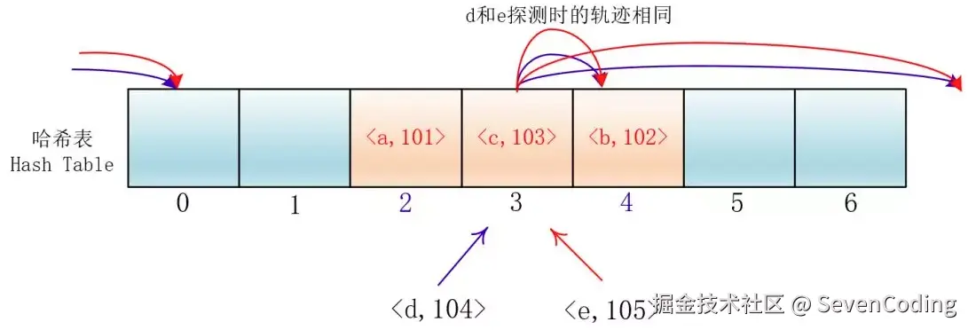 但是这样会有一个问题,就是随着键值对的增多,会在哈希表里形成连续的键值对。当插入元素时,任意一个落入这个区间的元素都要一直探测到区间末尾,并且最终将自己加入到这个区间内。这样就会导致落在区间内的关键字Key要进行多次探测才能找到合适的位置,并且还会继续增大这个连续区间,使探测时间变得更长,这样的现象被称为“一次聚集(primary clustering)”。