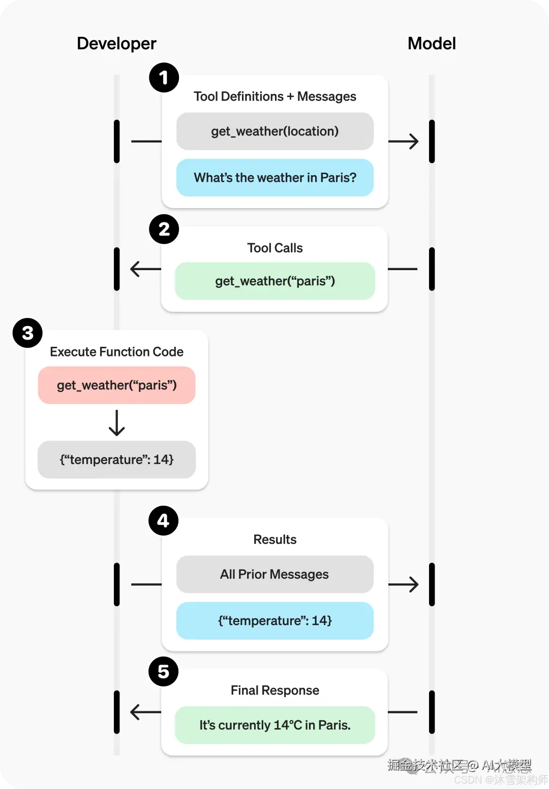 上图为OpenAI的函数调用的时序图,其中get_weather函数为本地定义的一个函数,需要与大模型至少进行2轮对话,才可以真正调用函数回答问题。