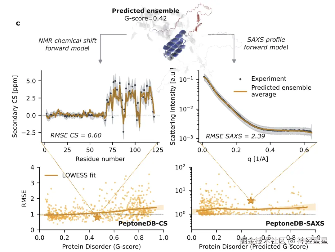 基于这些数据,如下图所示,研究人员构建了 PeptoneBench 评估框架,用于量化预测构象集合与实验数据的一致性。 整个流程包括:构象集合标准化与预处理;通过正向模型将预测结构映射为可与实验对比的观测量;基于归一化 RMSE 进行一致性评分,并在全程纳入模型与实验的不确定性。最终结果以 RMSE–G 评分关系图展示,并通过 LOWESS 平滑与自举法估计误差,进一步综合为 PeptoneBench 汇总评分,形成可直接比较不同工具性能的量化标准。