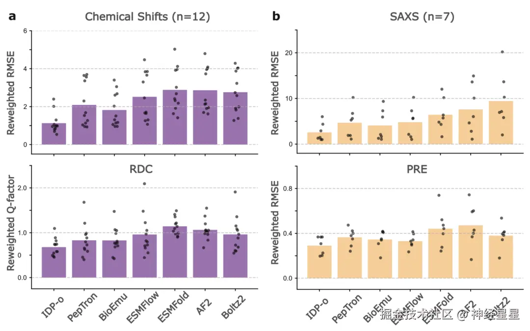 值得特别强调的是,某些初始 RMSE 较高的构象集合,通过最大熵重加权后反而可能更接近实验分布。为避免将「错误的权重」误判为「缺失的构象」,PeptoneBench 同时报告重加权前后的 RMSE,以区分可修正的采样偏差与不可恢复的构象缺失。 这一策略对高度动态、对实验条件极其敏感的 IDP 尤为关键:只要生成模型能够覆盖足够丰富的构象空间,即便实验环境不同,也能通过重加权过程快速适配,从而显著提升预测结果的实用性与可靠性。