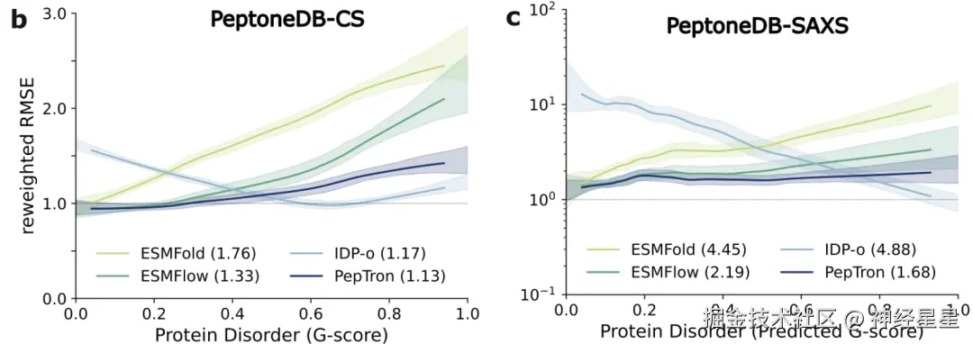 如下图所示,在 PeptoneDB-CS 数据集上,各模型的表现随蛋白质无序程度(G 评分)呈现显著差异:ESMFold 与 ESMFlow 在有序区域预测精确,但在无序区域性能明显降低;IDP-o 则呈现典型的互补模式——无序度越高性能越好;而 PepTron 在整个有序—无序构象谱上都保持稳定的高一致性。 这种均衡能力在 PeptoneDB-SAXS 数据集以及随后的重加权分析中再次被验证,说明 PepTron 在不牺牲有序结构精度的前提下,能够有效捕捉无序蛋白的构象多样性。
