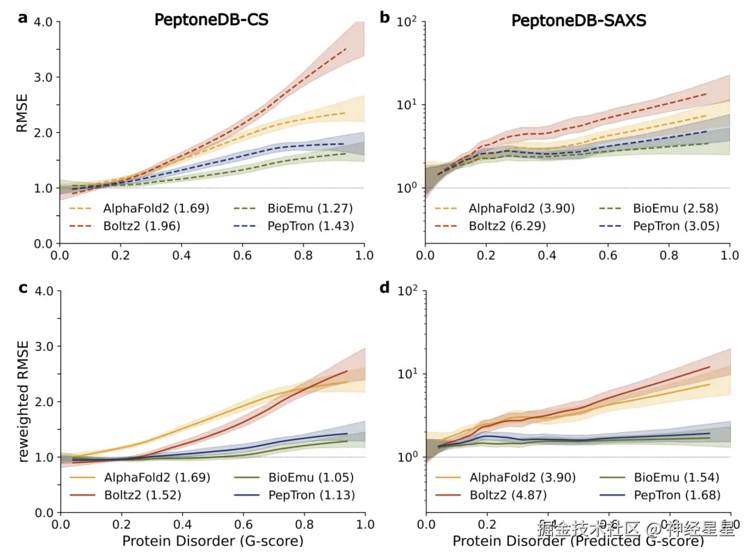 进一步的跨模型对比结果如下图所示,AlphaFold2 与 Boltz2 虽然在有序蛋白的预测中依旧占优,但随着无序程度上升,其性能出现系统性衰减;相比之下,PepTron 与 BioEmu 在整个构象谱上都保持更强的稳健性,更适合处理 IDP 高度异质的结构特征。