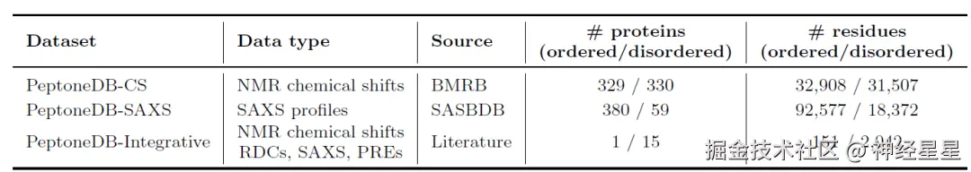 为此,如下表所示,研究人员建立了 3 个互补的数据资源:PeptoneDB-CS(源于 BMRB 的 NMR 化学位移)、PeptoneDB-SAXS(来自 SASBDB 的 SAXS 图谱)以及 PeptoneDB-Integrative(整合多种正交实验数据的 IDP 专用集)。三类数据结构不同、信息互补,CS 揭示局部结构,SAXS 反映整体构象,Integrative 支持交叉验证。