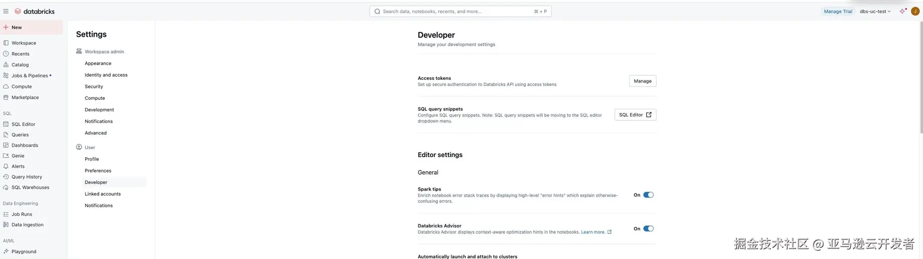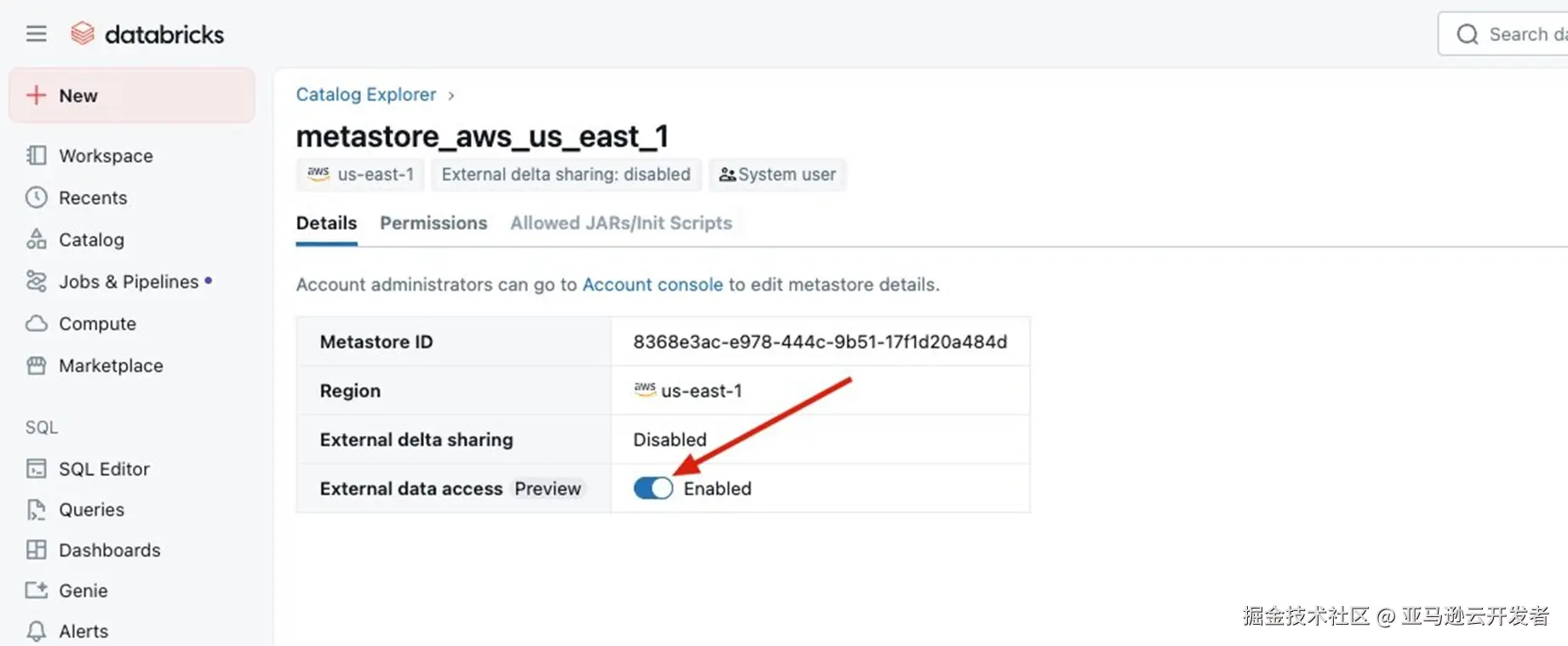 - 首先我们需要开启Databricks的Catalog External Access, 配置步骤如下.