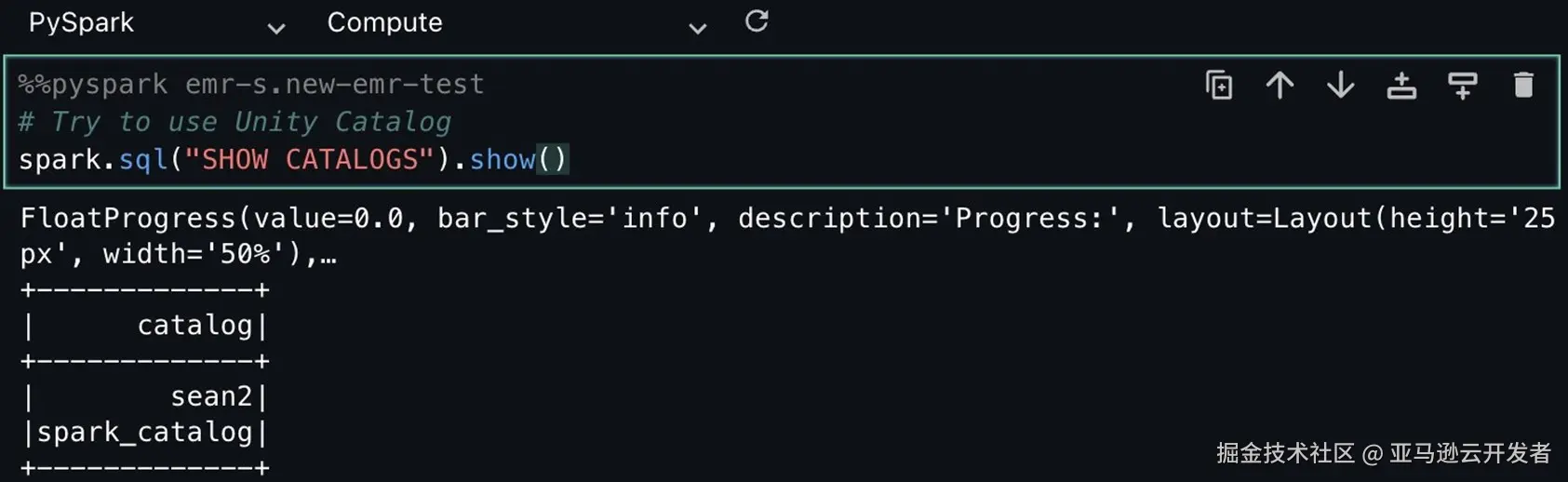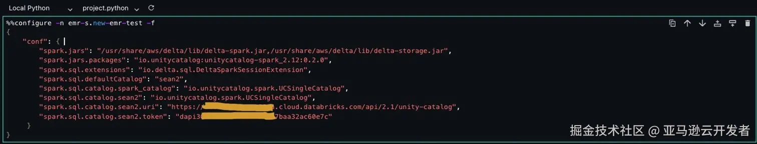 在我们创建Sagemaker Unified Studio的时候,会默认选上Glue Catalog作为Catalog的默认选项,如何我们想在Notebook内使用Databricks Unified Catalog, 我们需要覆盖原有Glue Catalog配置信息,注意下面的catalog信息.