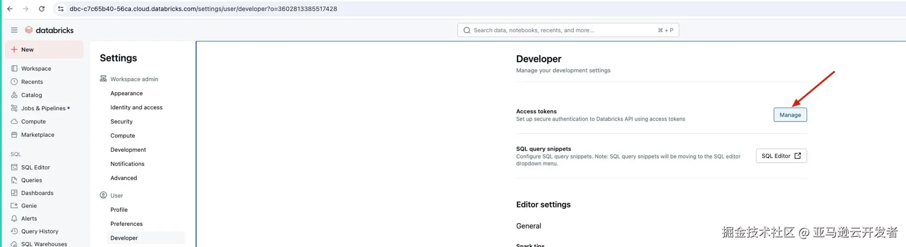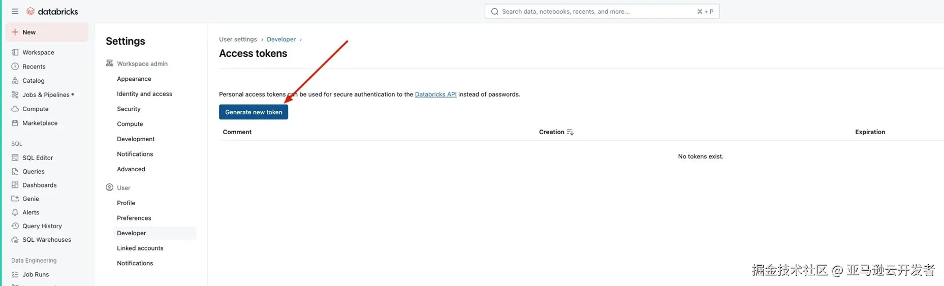 - 配置对用Databricks 用户Personal Access Token,点击用户Settings 选项