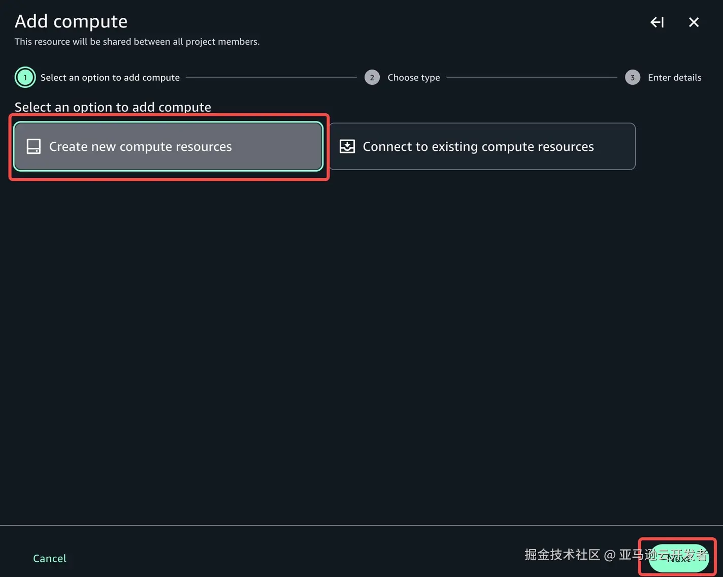 - 您可以选择连接到现有计算资源。如果您为创建资源,可以选择Create new compute resources,点击 next