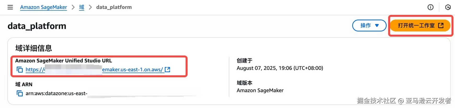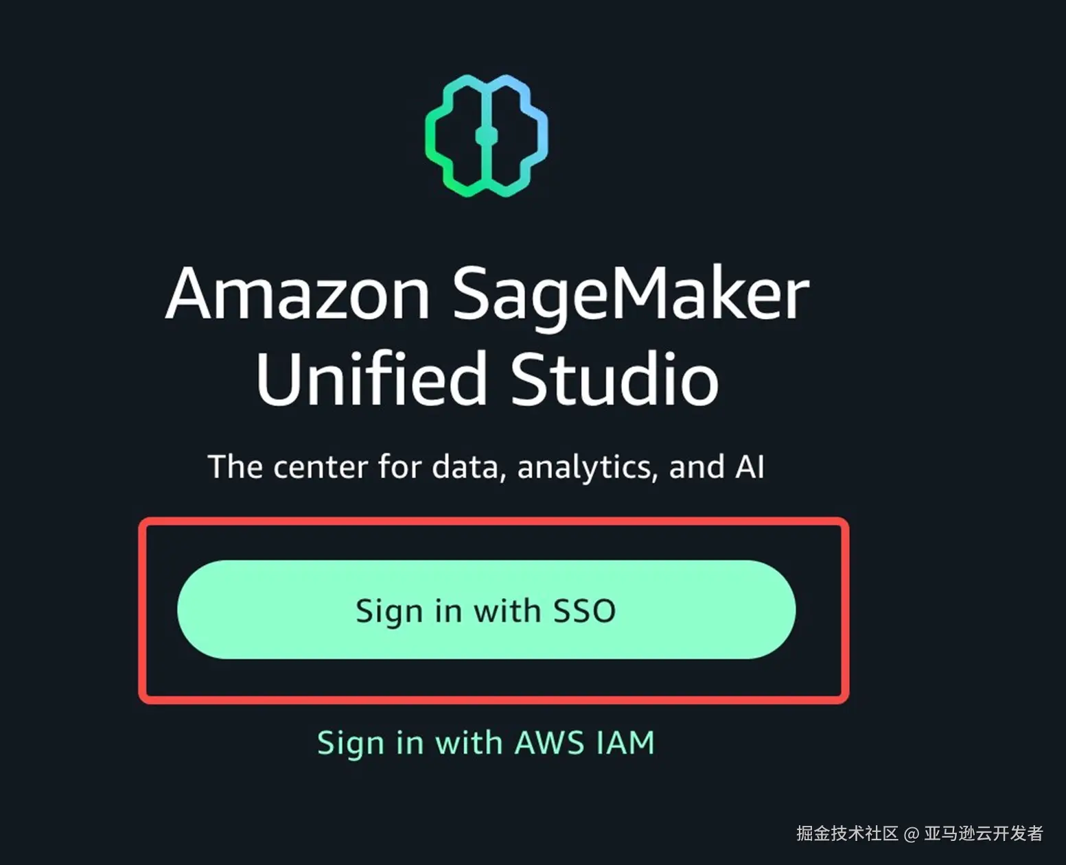 - 创建成功后通过url或者“打开统一工作室”按钮登陆Amazon SageMaker Unified Studio。点击后选择 SSO 方式登陆。输入在IAM 身份中心设置的用户名和密码。