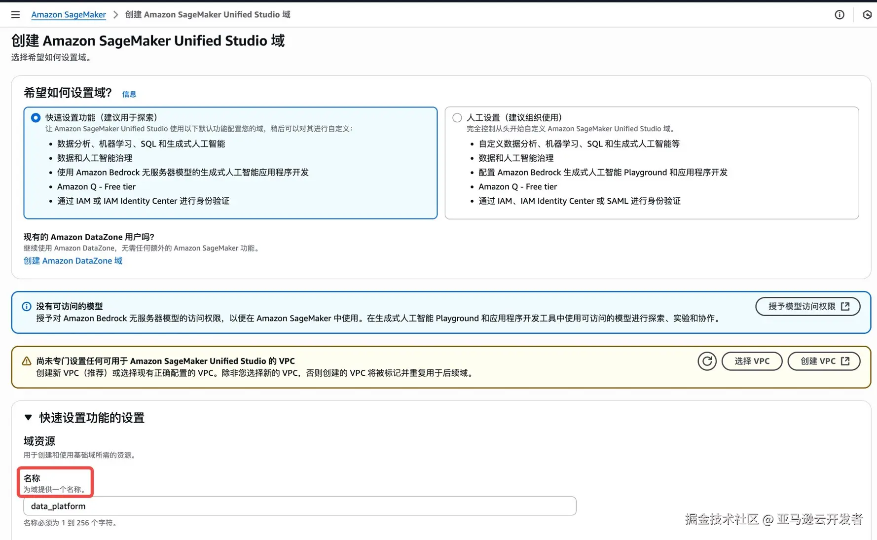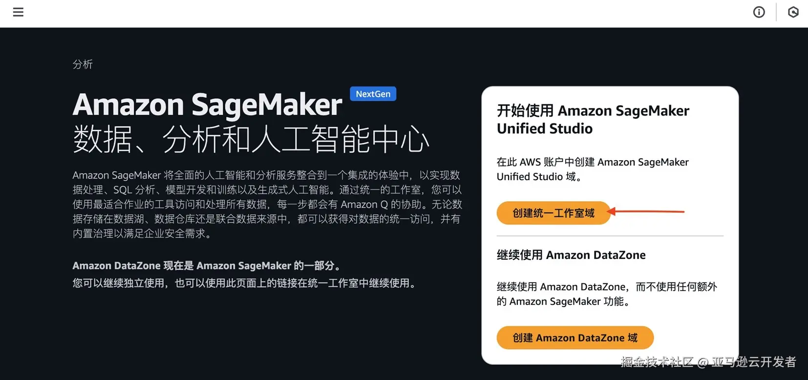 - 要开始创建域,请在 Amazon SageMaker 控制台上点击 创建统一工作室域按钮。