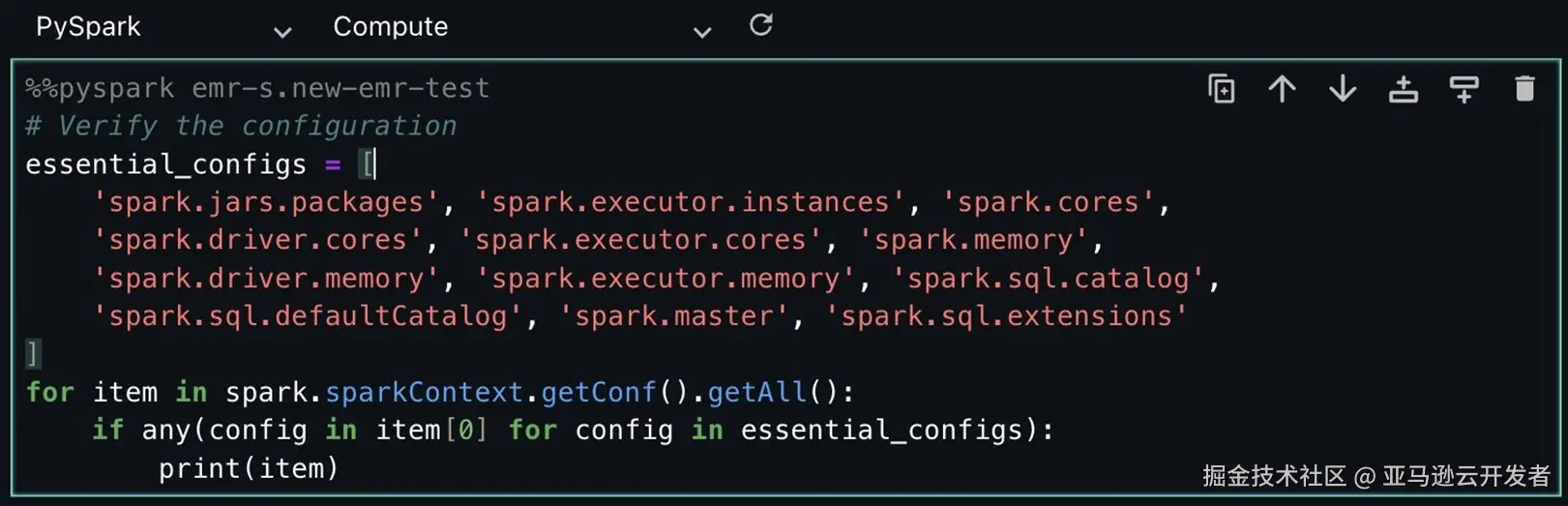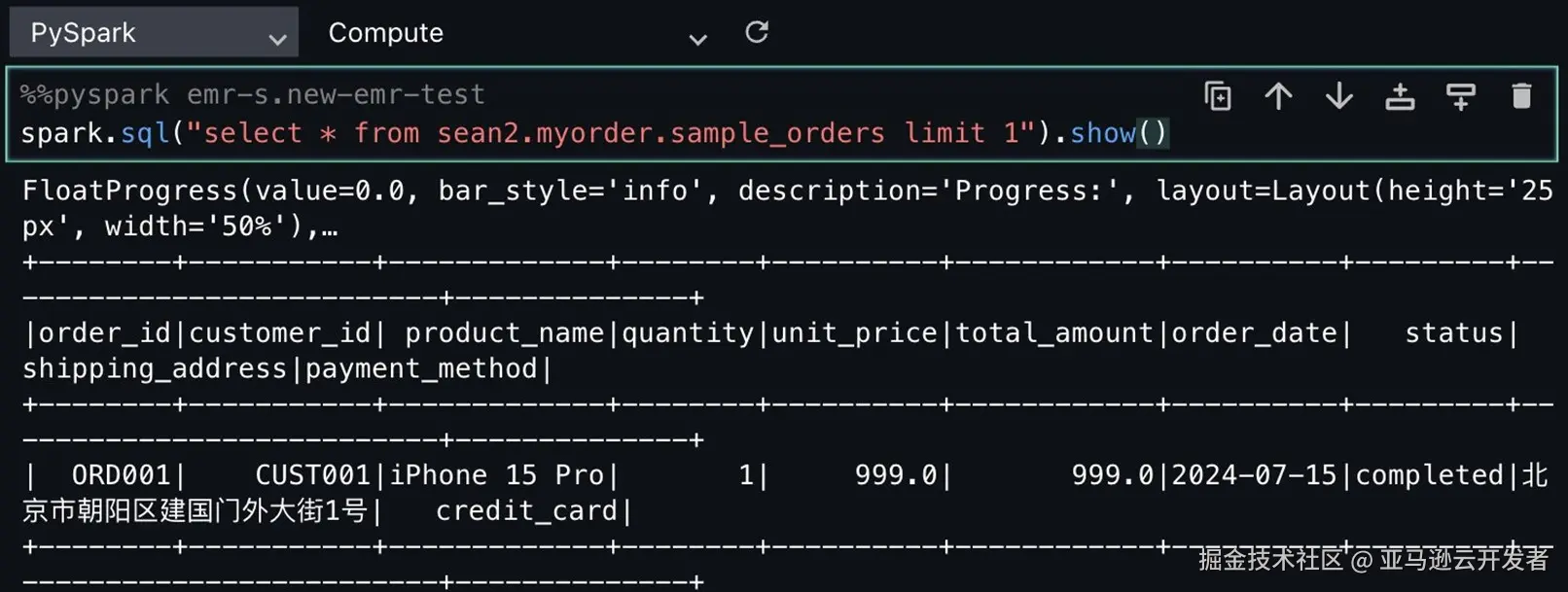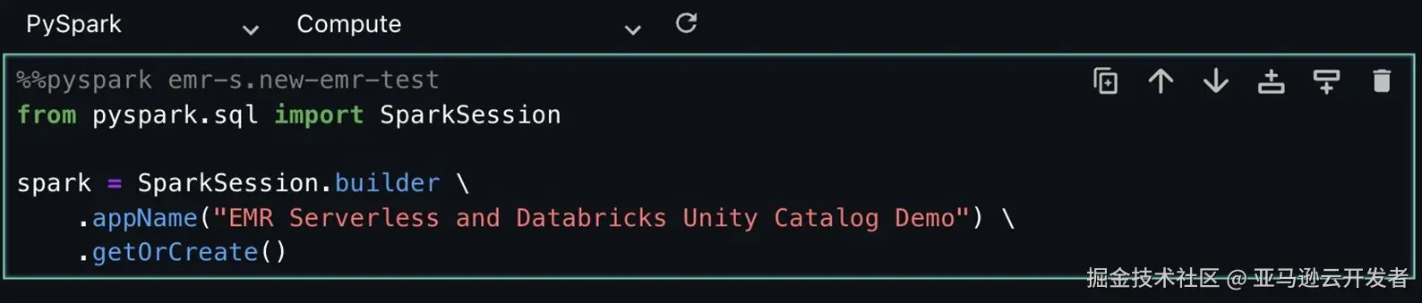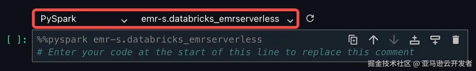 如果想使用emr serverless计算资源,请在每个单元格上方进行选择,左侧选择pyspark,右侧选择创建好的emr serverless资源