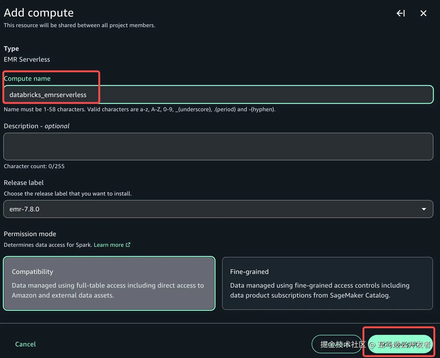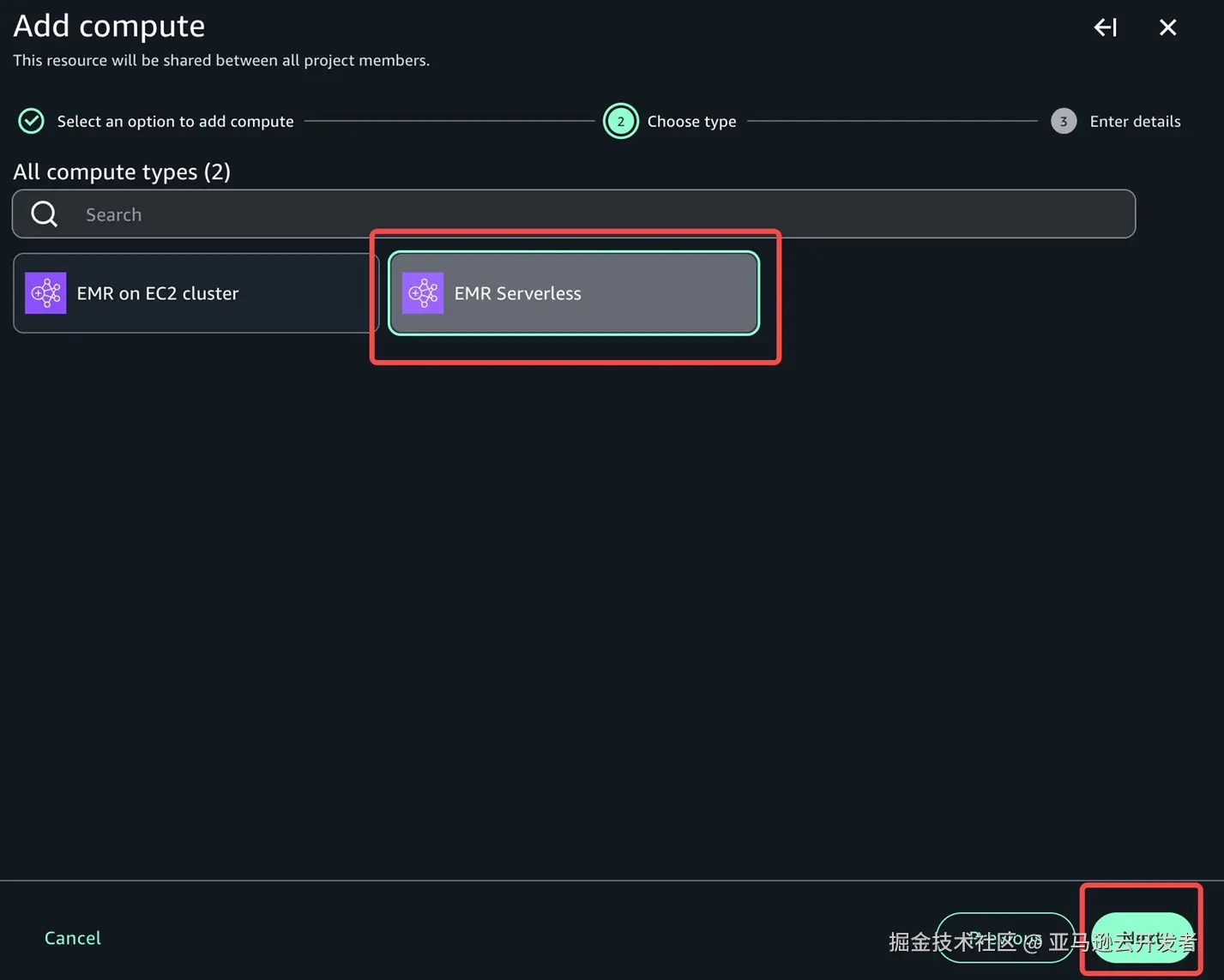- 关于计算资源种类,我们选择EMR Serverless , 点击 next, 修改compute name,其他保持默认值,点击 add compute