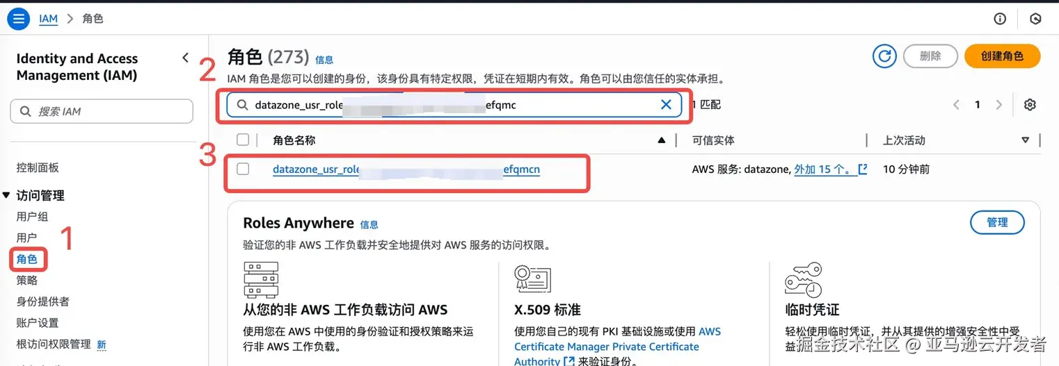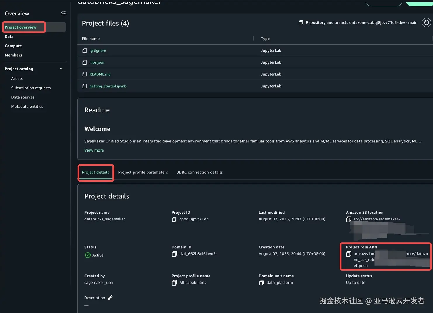 - 我们先在左侧概览下选择Project overview,在Project details找到Porject role arn,从 datazone_user字段开始复制