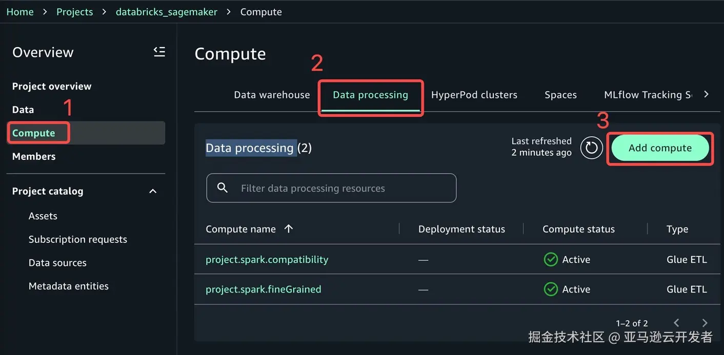 - 下一步我们来添加EMR Serverless 计算资源。进入项目后,在左侧概览下选择compute,点击Data processing,点击 add compute。