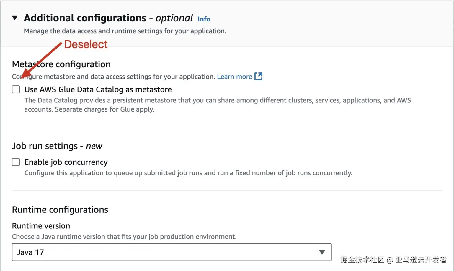下面我们需要修改 EMR Serverless Application 的配置, 为了保证后面我们在 Sagemaker Unified Studio 中的配置一致,我们需要修改Application的 Application configuration 和 Additional configurations. 修改的内容如下