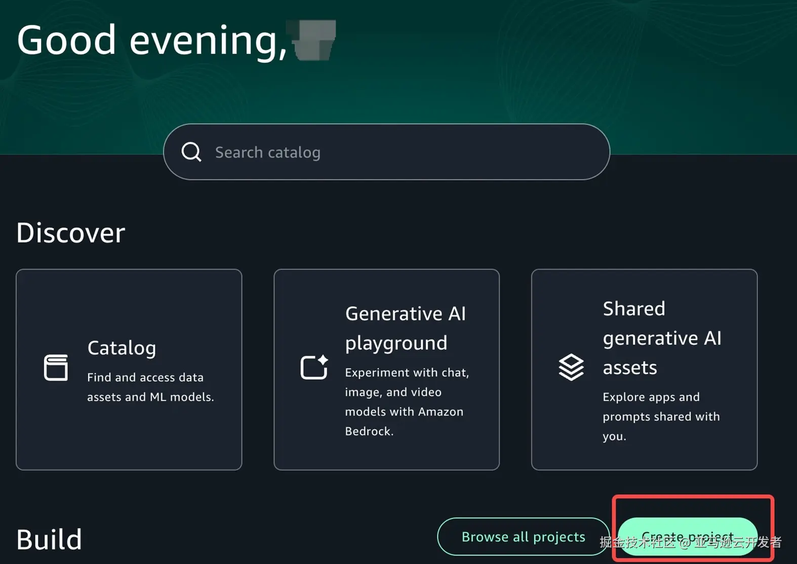 - 登陆后点击创建项目,在 Amazon SageMaker Unified Studio 中,通过项目汇集人员、数据和工具,使数据用户群体能够协作解决特定的业务用例。