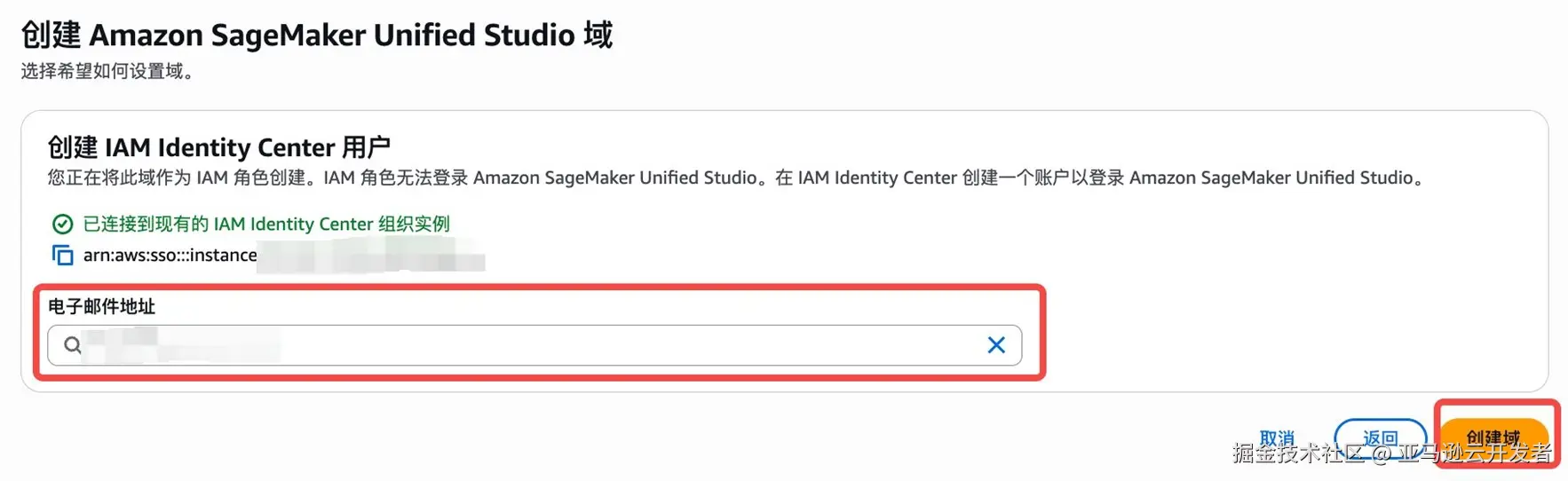- Amazon SageMaker Unified Studio 域默认支持 IAM 用户身份验证。在此输入IAM Identity Center中用户电子邮箱地址。
