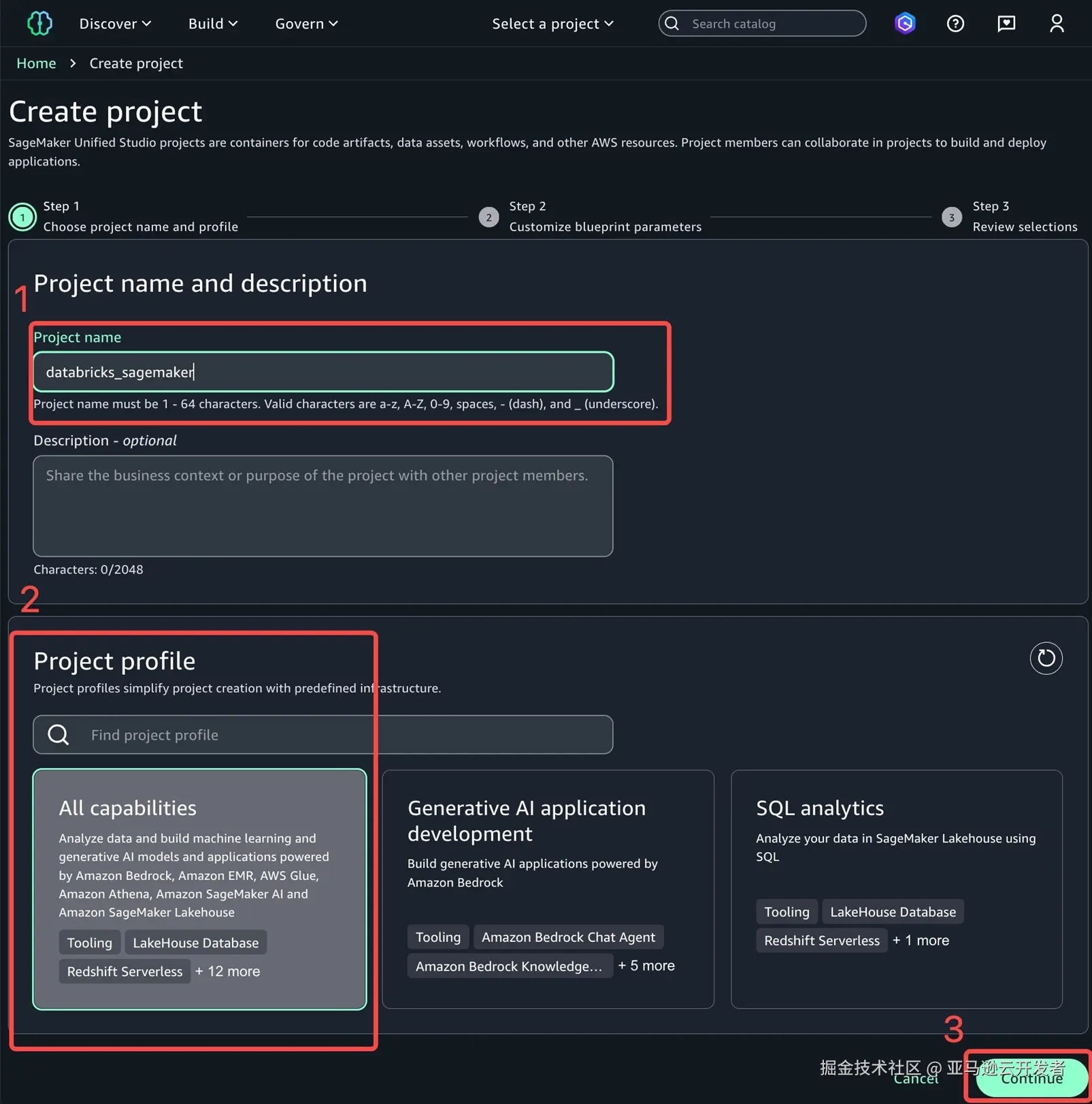 - 修改项目名称,选择合适的项目配置文件。项目配置文件是用于创建项目的配置蓝图的集合。蓝图定义了项目成员在处理 Amazon SageMaker 目录中的数据时可以使用哪些亚马逊云科技工具和服务。这里选择的是所有功能,选择后点击继续。