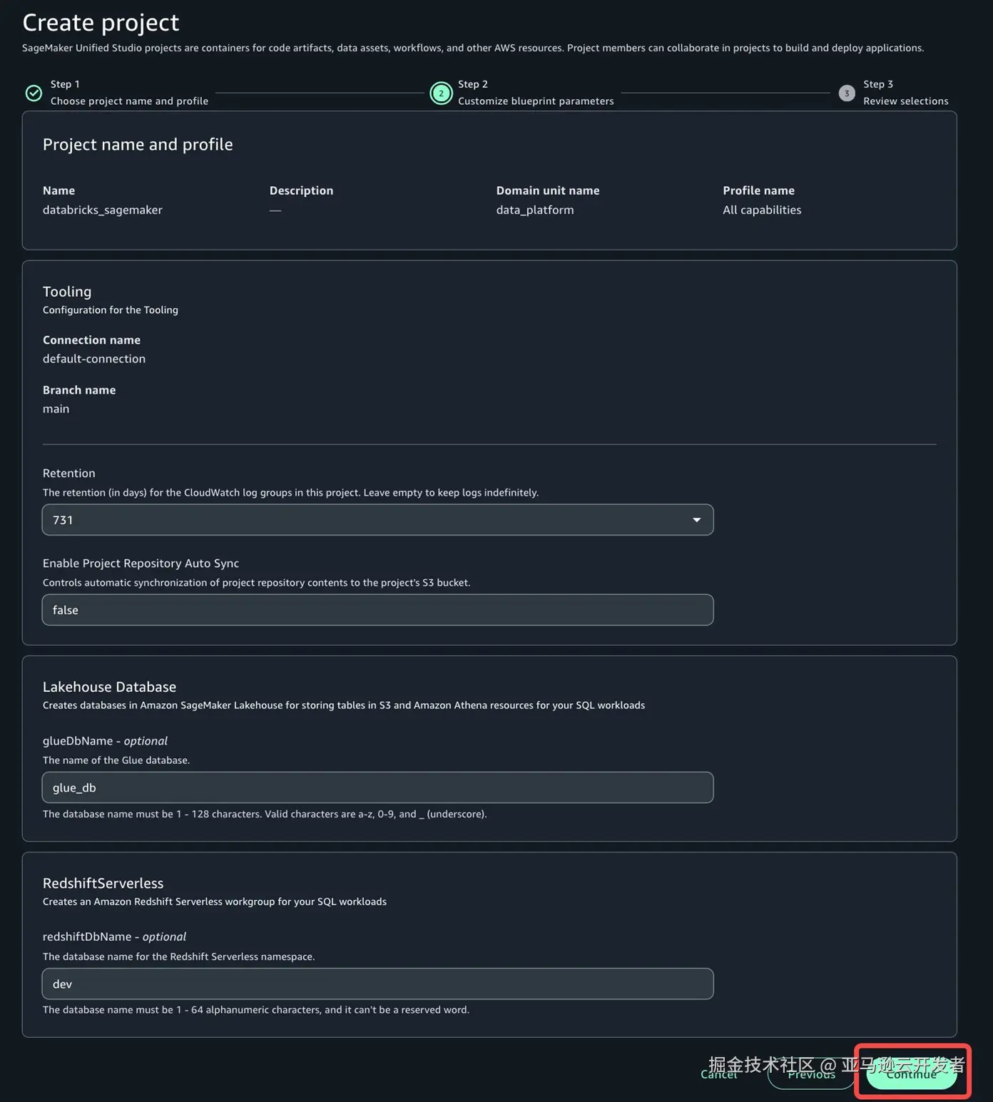 - 可以按需更改日志保留期等配置,由于在此场景下已经禁用了glue catalog,可以忽略lakehouse database中的glue database name更改,这里保持默认设置。点击继续。跳转到下一页后再选择 创建项目。创建成功后,您将被重定向到项目主页。