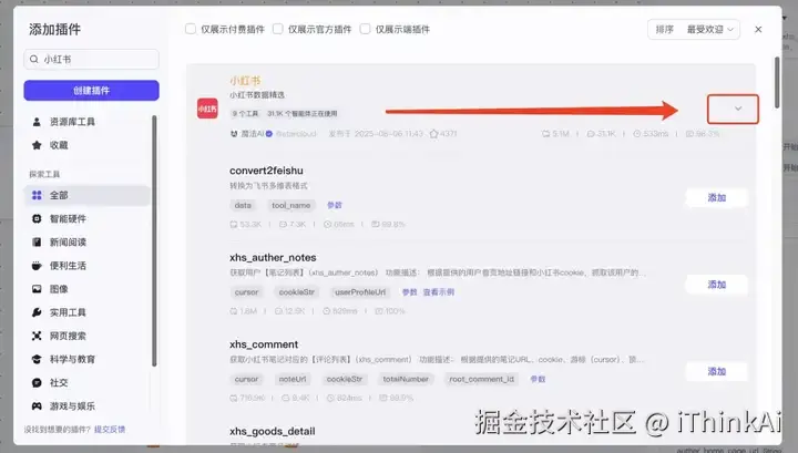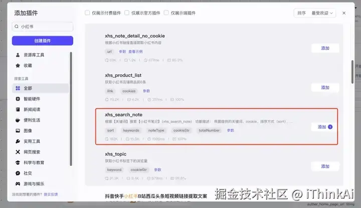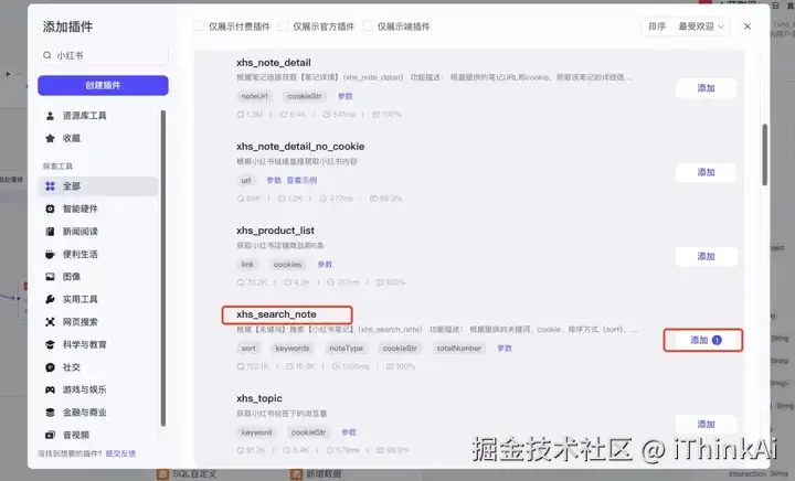 在插件商店搜“小红书”,选xhs_search_note工具。cookieStr引用开始节点的cookie变 量;keywords引用开始节点的input;noteType设置作品类型(0 = 全部,1 = 视频,2 = 图文);sort设置作品排序(0 = 综合);totalNumber查询数量设为50最合适。