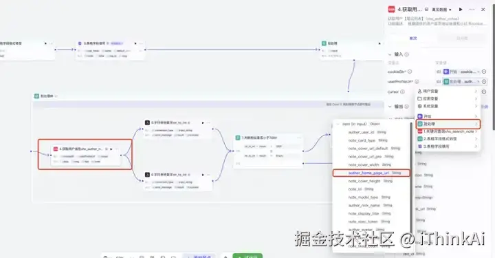 在插件商店搜“小红书”,选xhs_auther_notes工具。cookieStr引用开始节点提供的 cookie;userProfileUrl从一堆变量中找到博主的首页地址进行引用。