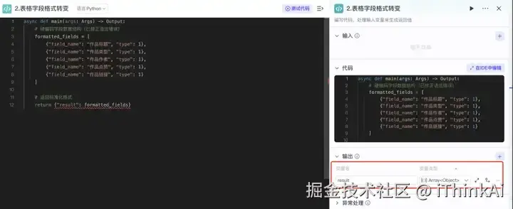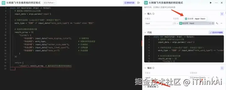 用代码输出符合飞书多维表格的格式,代码可复制,需找作者领取。输入引用批处理的 “input”,输出变量名为“result”,类型是Array,代码为python代码。