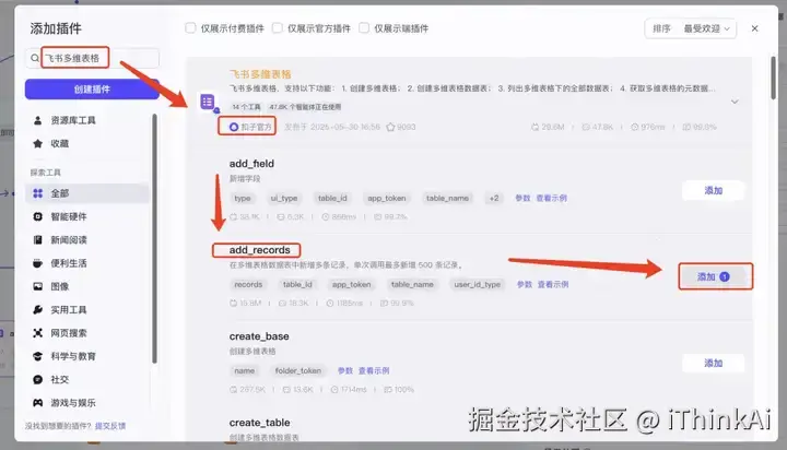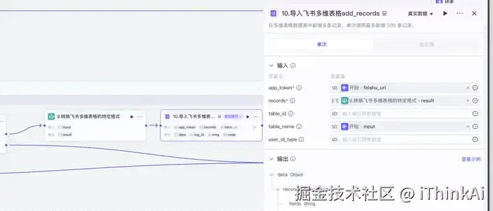 在插件商店搜“飞书多维表格”,添加add_records工具。records引用节点9的输 出;app_token引用开始节点feishu_url;name引用开始节点的input。最后将线连接到最右 侧的点。