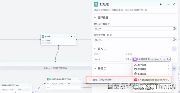 判断器节点,官方节点。引用节点5的输出“result”,设置小于“7000”且输出不为空。下面 的点连接批处理右边框,上面的点连接判断作品点赞的判断器。