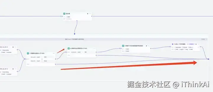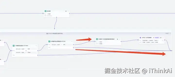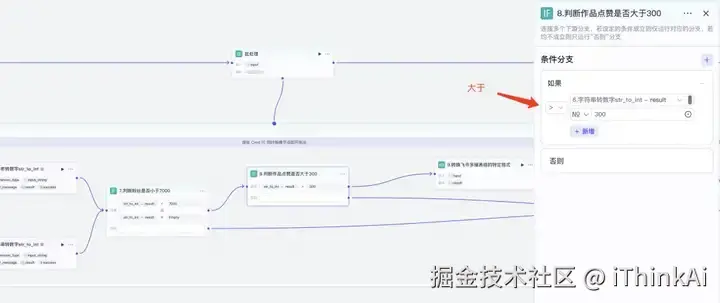 判断器节点,官方节点。引用节点6的输出“result”,设置大于“300”。下面的点连接批处理 右边框,上面的点连接下一个节点。
