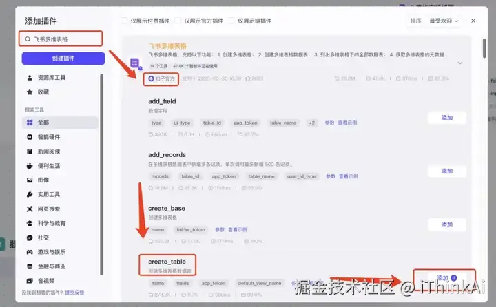 在插件商店搜“飞书多维表格”,添加create_table工具。app_token引用开始节点 feishu_url;name引用开始节点的input;fields引用节点2的输出。