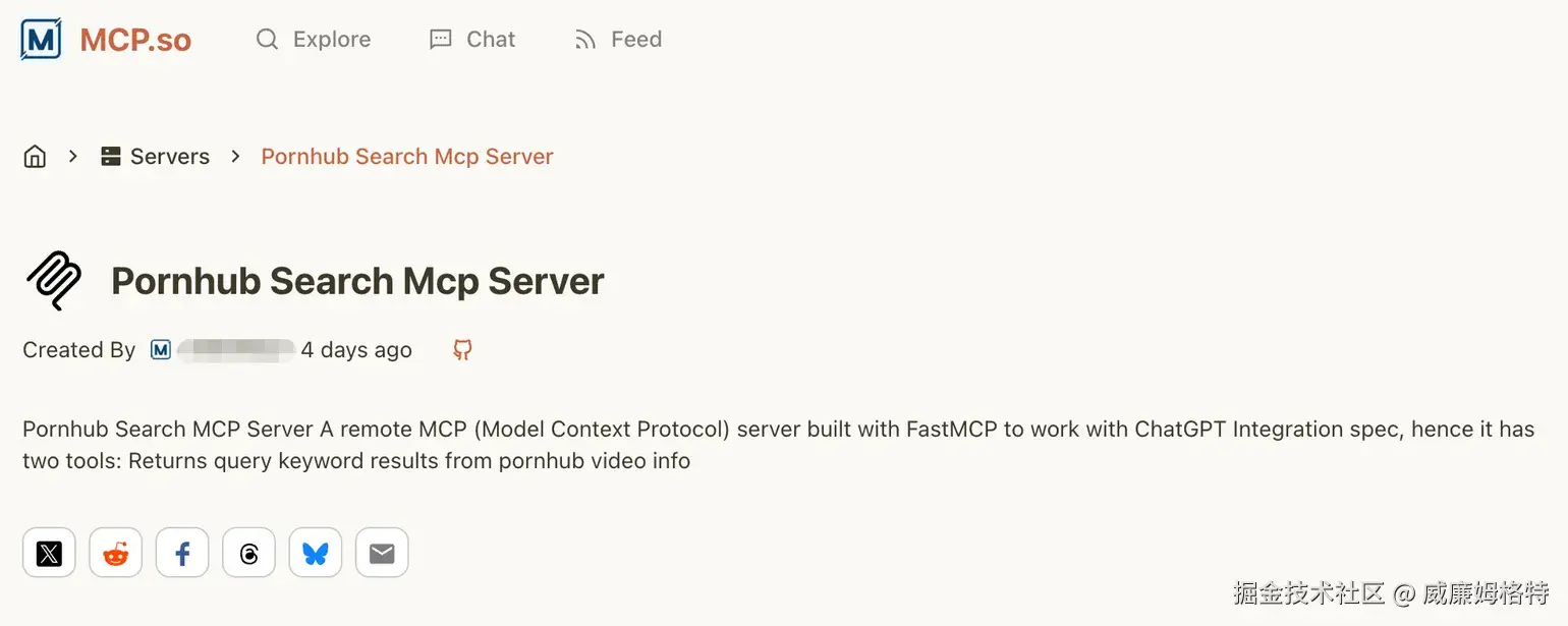 利用公开的API快速封装了一个功能正常的远程MCP Server,并将其包装成一个热门网站Pornhub的视频搜索工具。