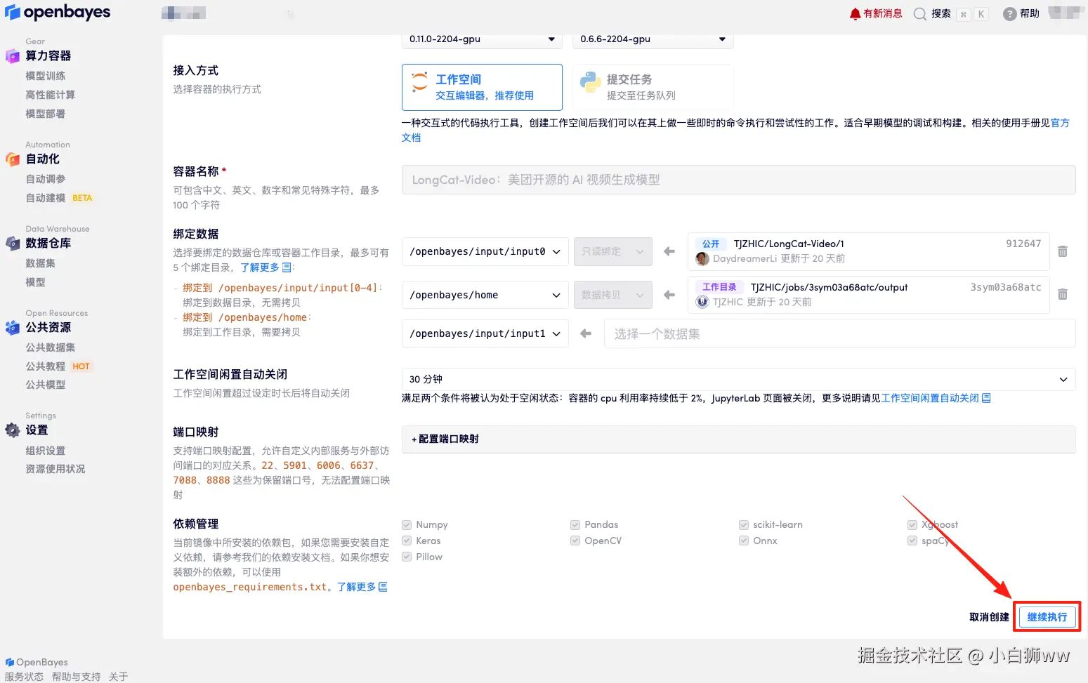 在当前页面中看到的算力资源均可以在平台一键选择使用。平台会默认选配好原教程所使用的算力资源、镜像版本,不需要再进行手动选择。点击「继续执行」,等待分配资源。