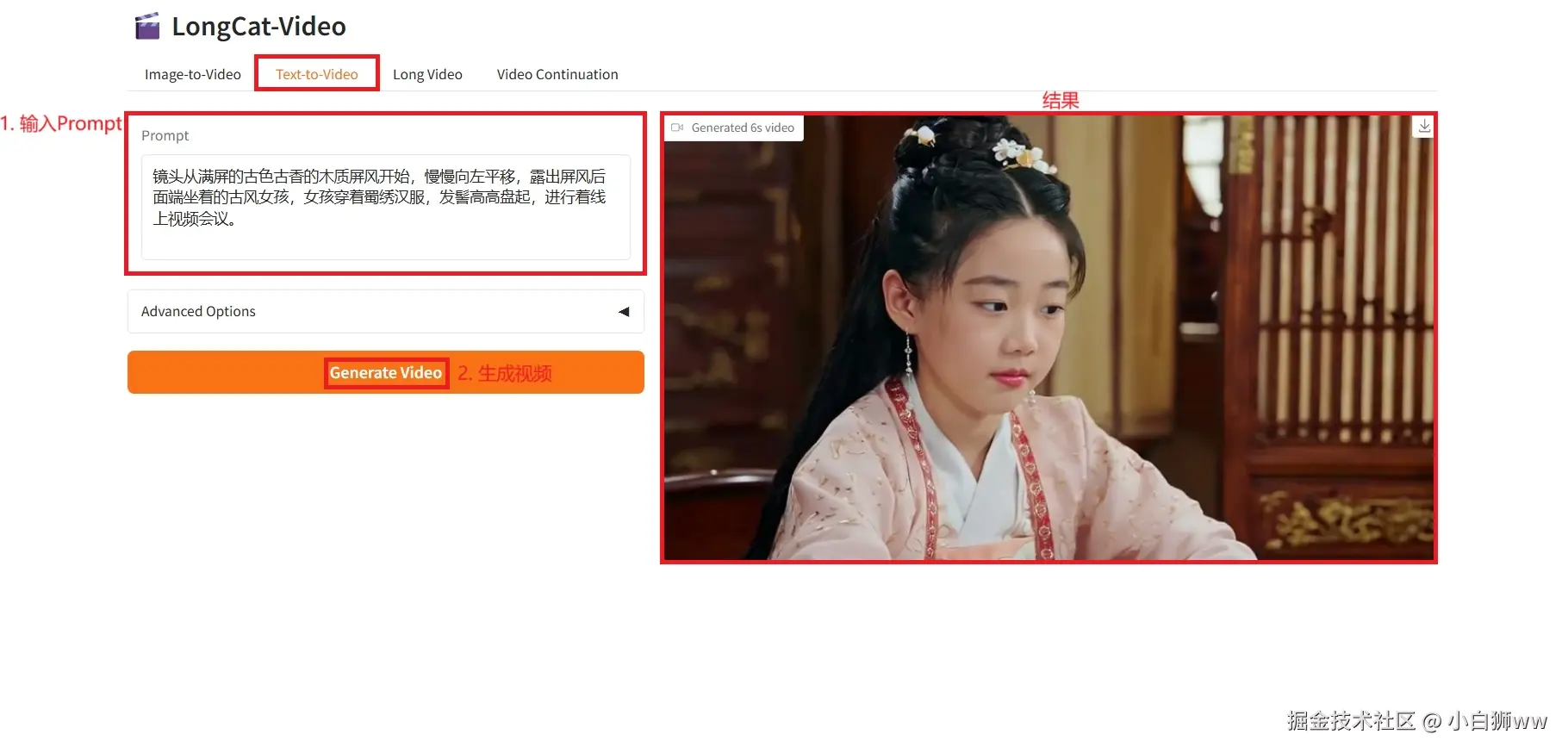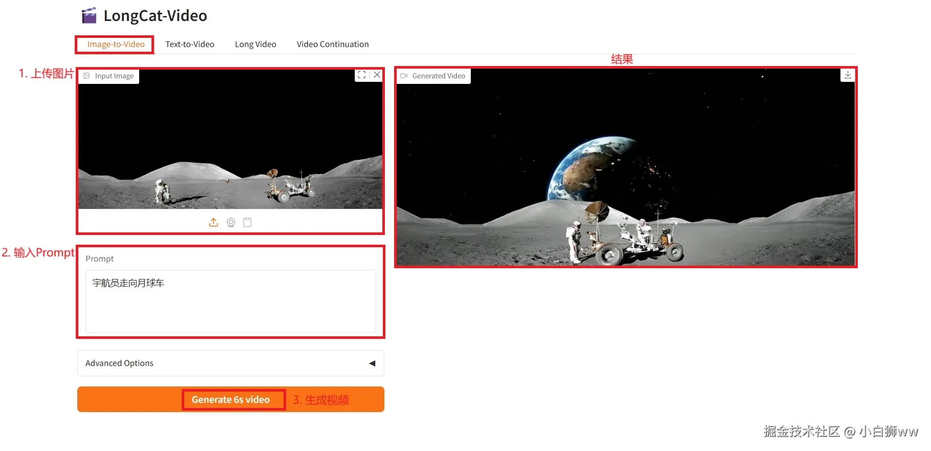 以下分别是 4 种视频生成方式的使用步骤和效果展示: