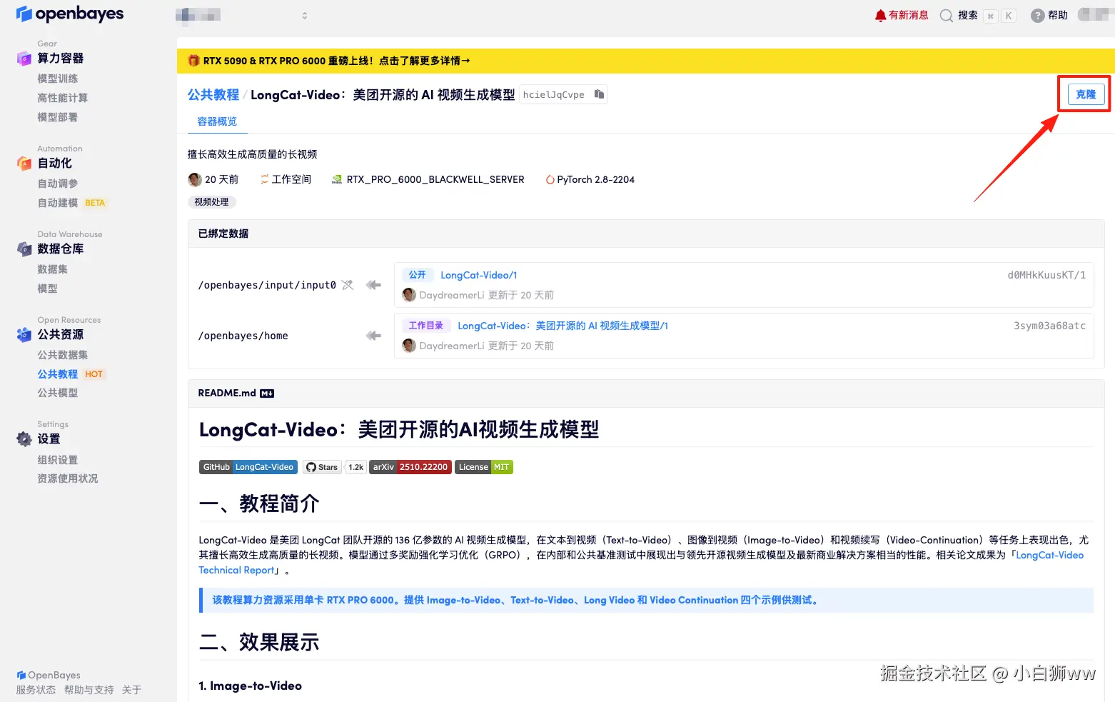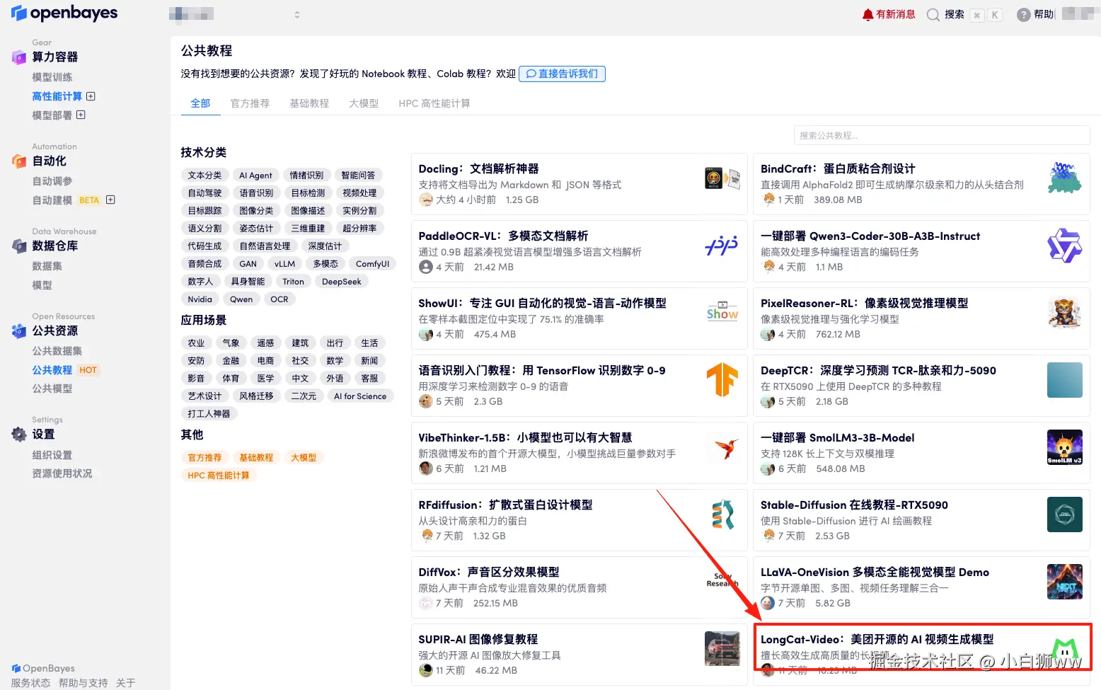 首先点击「公共教程」,找到「LongCat-Video:美团开源的AI视频生成模型」,单击打开。
