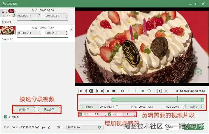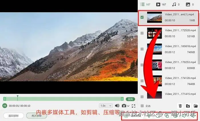 步骤3:录制完成后,软件会自动跳转至预览页面,刚录好的视频就能即时查看。是否漏录内容、声音是否清晰,都一目了然。如果觉得视频还有优化空间,点击 “高级剪辑” 就能进入后期编辑界面,在这里可以将长视频分割成多个片段,还能添加转场特效,让视频效果更出彩!
