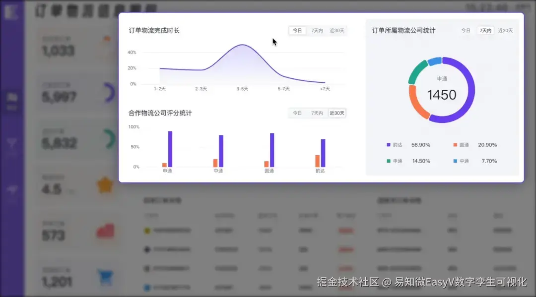 易知微的「订单管理跟踪驾驶舱」,整合了订单物流时长、评分、详情及所属公司等关键信息,打通多平台数据,实现了订单状态的全局掌控。它不仅能实时同步数据、减少人工误差,更能通过全链路协同管理,直接复用至订货、财务、仓储等多元业务场景——往往只需替换文字与数据,即可快速落地。