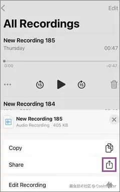 iPhone 语音备忘录的内置共享功能也可用于传输语音备忘录。