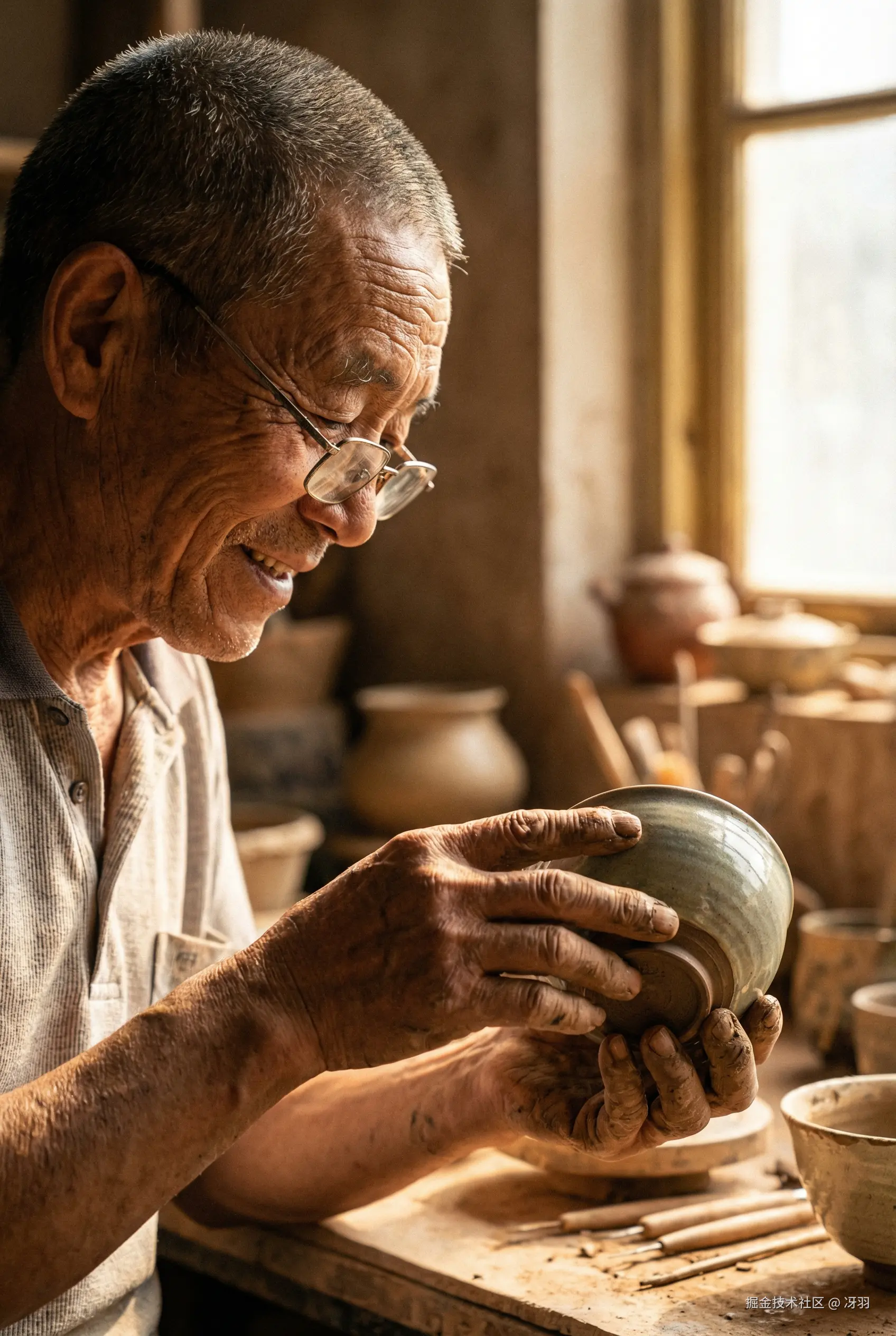 一幅高度写实的特写肖像,描绘了一位年长的中国陶艺家。他脸上有着深深的、被阳光刻下的皱纹,带着温暖而洞悉一切的微笑。他正仔细检查一个刚上釉的茶碗。场景设定在他那质朴且阳光充足的工作室里。柔和的黄金时刻光线透过窗户洒入,照亮了黏土细腻的纹理。这幅肖像使用 85 毫米人像镜头拍摄,背景呈现出柔和模糊的效果(焦外成像)。整体氛围宁静而娴熟。肖像采用垂直构图。