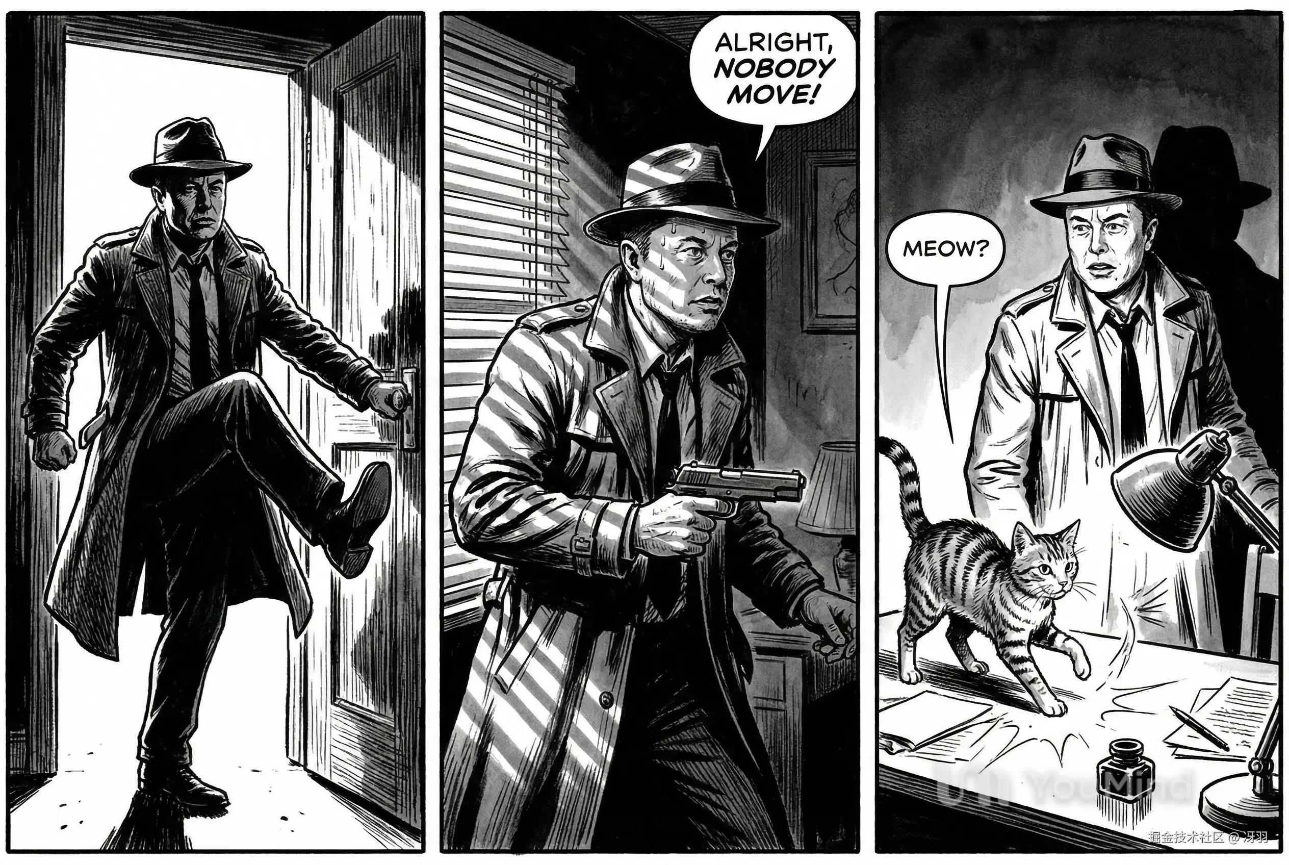 创作一个三格漫画,采用粗犷的黑色电影艺术风格,运用高对比度的黑白墨水绘制。让角色处于一个幽默的场景中。