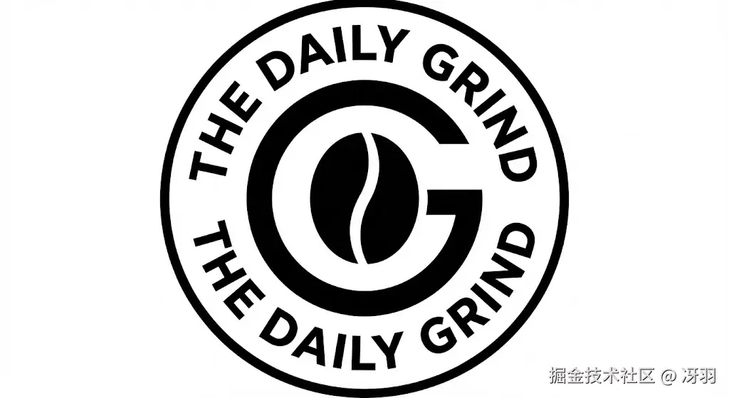 为一家名为 “The Daily Grind” 的咖啡店设计一个现代简约风格的标志。文字部分采用简洁、粗体的无衬线字体。配色方案为黑白两色。将标志置于圆形之中。巧妙地融入一颗咖啡豆元素。