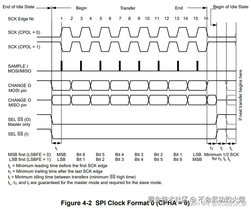 从如下图中看到,当CPOL(时钟极性控制)为0时,IDLE(空闲)状态,时钟保持为0,当CPOL(时钟极性控制)为1时,IDLE(空闲)状态,时钟保持为1。 SCK第一个边沿前tL个时钟周期拉低SS(片选)信号,此时发送第一个数据,从图中可以看出,发送数据在第0、2、4、6、7、10、12、14个时钟边沿时,即偶数沿;采样数据在第1、3、5、7、9、11、13、15个时钟边沿时,即奇数沿;数据可以是MSB first(高位在前),也可以LSB first(低位在前),在FPGA实现中一般为高位在前,具体与从设备一致即可。 在发送/采样结束之后,在最后一个SCK沿后再等待tT时间回到IDLE(空闲)状态,IDLE(空闲)状态至少保持tI 再进行下一次传输。 从图中看出:tL、tT、tI最少保持二分之一个时钟周期。